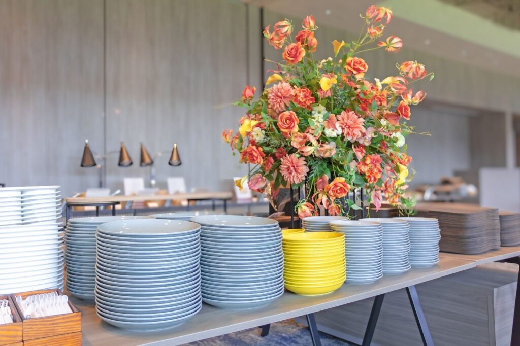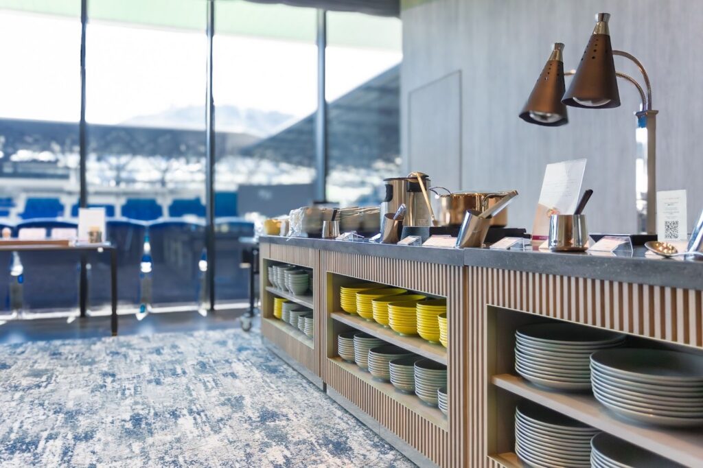 青々とした芝が美しいスタジアムが一望できる朝食会場には、コモンのマグやプレートがずらり。